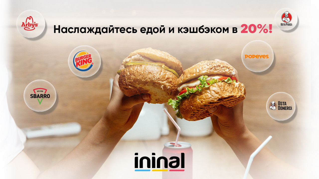В рамках акции пользователи ininal, осуществляющие оплату в ресторанах Burger King, Arby’s, Popeyes, Sbarro, Usta Dönerci и Usta Pideci получат кэшбэк в 20%от суммы оплаты.